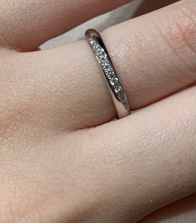 ダイヤモンドが付いていて華やかなイメージながら、派手すぎず仕事にも付けていける上品なデザインであることが決め手となりました。結婚指輪は今後ずっと付ける予定なのでシンプルで飽きないデザインというのも気に入っています。婚約指輪との重ね付けも違和感なかったです。