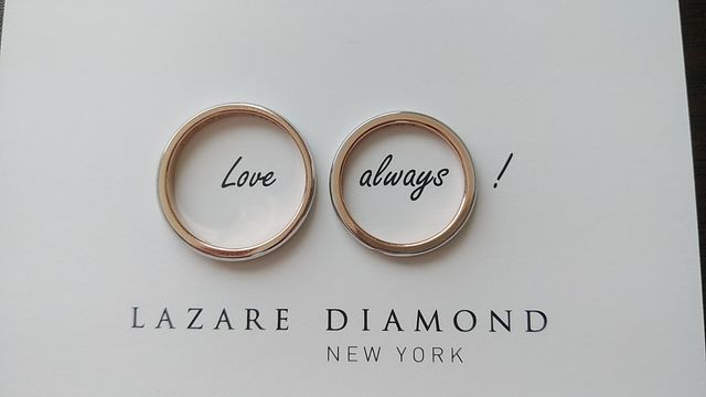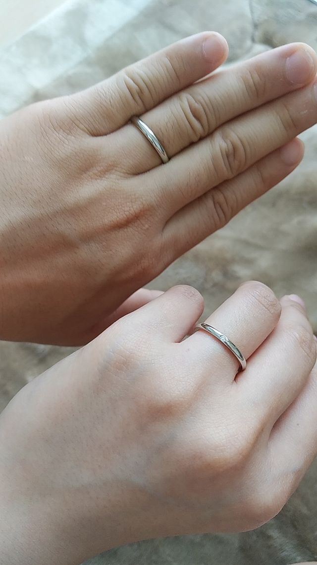 婚約指輪は私主体で選んだので、結婚指輪は彼の意見重視でシンプルなデザインを探しました。ただ、外側はプラチナでストレートなのでとってもシンプルですが、内側がピンクゴールドで着用時に横から見ると違いがわかります。さりげないデザインが気に入りました。2人ともプラチナとピンクゴールドのコンビリングですが、彼のデザインはノアゼットで私のデザインバーベナです。それぞれ指輪の幅の太さやダイヤの留め方の好みで決めました。