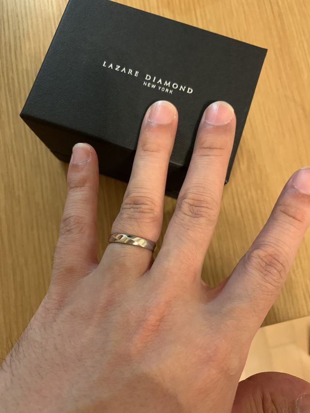 いろいろな店舗を見てみましたが、このラザールダイアモンドさんのデザインが非常に良いと感じました。他のブランドではシンプルなデザインが多かったですが、こちらは多くの種類の指輪から検討できました。その中でも選んだ指輪は太さやデザインが男らしくて良いと思い、そこが決め手になりました。