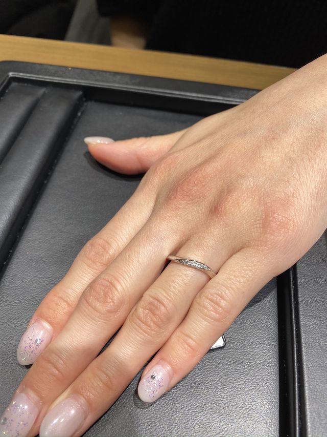 あまりゴツくない、シンプルな指輪を探していました。ストレートタイプにしようと思っていたのですが、こちらの指輪をなんとなく付けてみまたところ、指の形が綺麗にみえたのでウェーブタイプに変更!指が細く長く見える気がします。小さな石がキラキラと光ってとても綺麗でした。