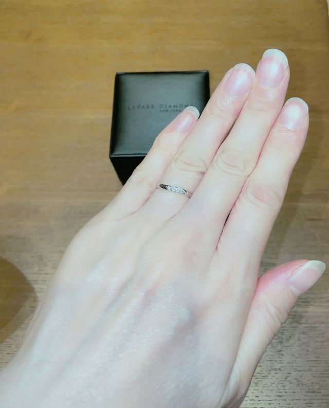 婚約指輪は無しにしたため、ダイヤモンドがあるデザインが絶対条件でした。ただ飽きのこなく指が綺麗に見えるデザインであったことと、毎日つけるものなので違和感なく、試着した時に指に馴染んでいた事が1番の決め手になりました。