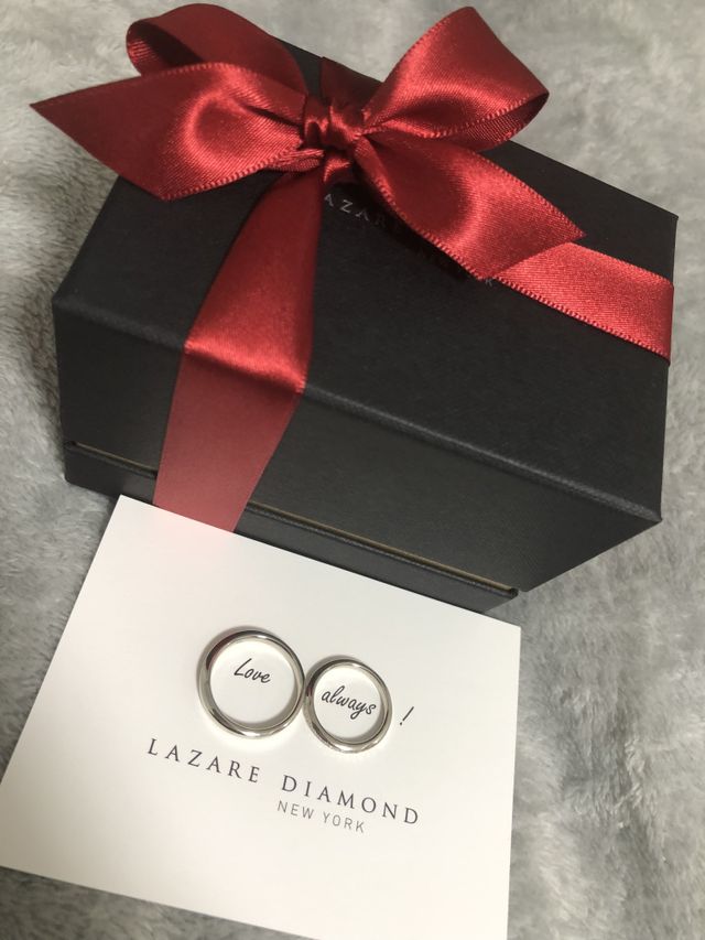 婚約指輪もこちらで購入しており、結婚指輪も迷わずラザールダイヤモンドに見に行きました。候補のひとつにアプローズを入れており試着したのですが、私にはちょっと華やかすぎるように感じられました。そこで担当の方に提案していただいたのがグレイシャスでした。ホームページで見たときはシンプルすぎるかなと思っていましたが、実際につけてみると白っぽく輝き上品な印象でひとめぼれ。二人とも気に入り購入に至りました。