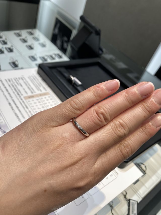 正面にダイヤが3粒ついているものは他ブランドでも多々見受けられますが、ここの指輪はダイヤが9個付いているということで、前(他人)から見ても、自分からみても輝きが楽しめるというところがとても素敵でした。