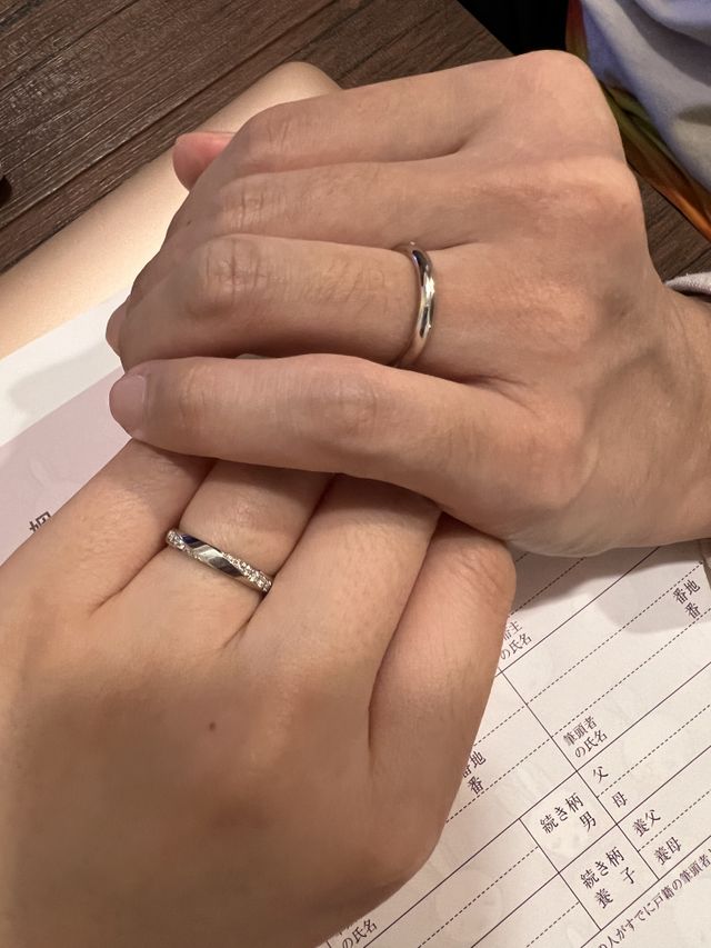 婚約指輪との相性がばっちりで、ときめいたので購入しました。初めはシンプルなただのシルバーで良いと思っていたのですが、実際にお店を訪れてみると、やはりダイヤモンドがとても綺麗で、手元が華やかになるのでこのデザインに決めました。