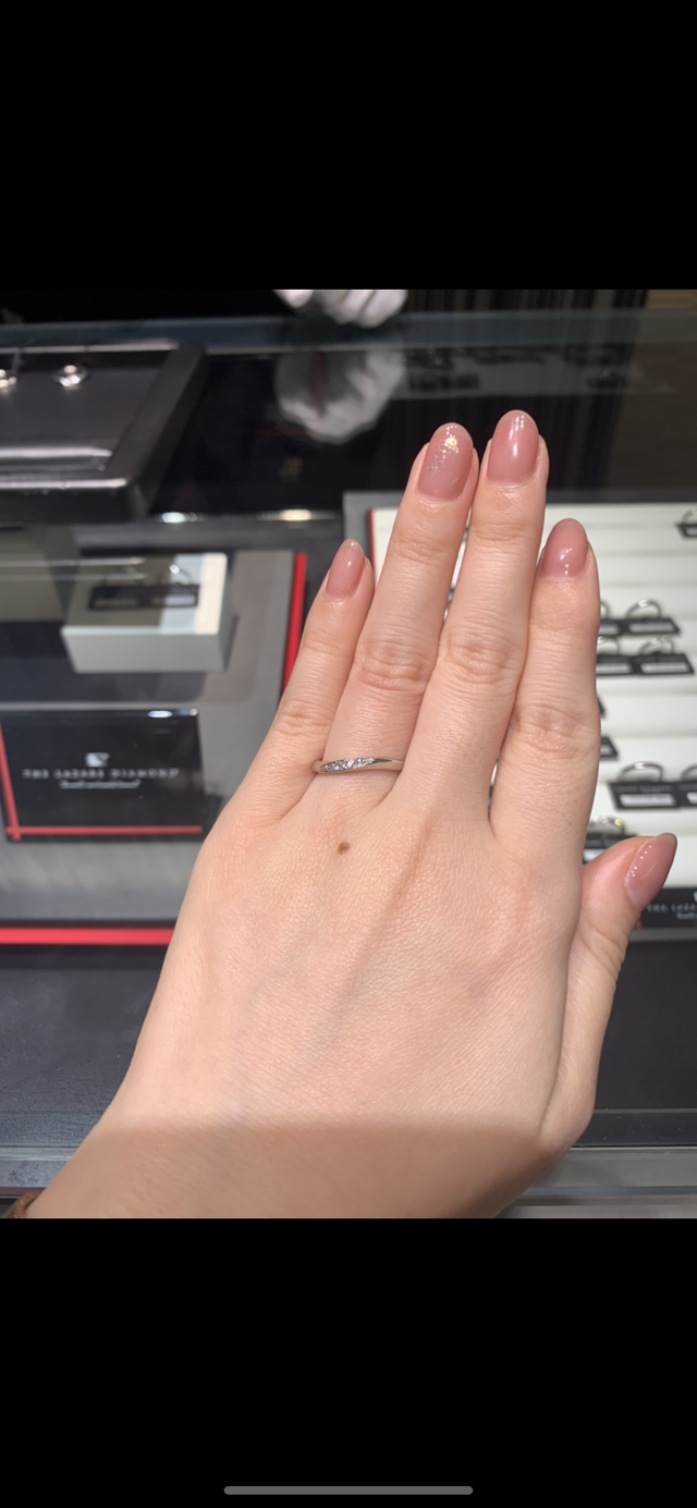 ダイヤモンドが多くはないがキラキラしていてそこがいいなと思います。キラキラしすぎないのがいいけどダイヤモンドは欲しいという人にぴったりです。ウェーブのデザインなので指が綺麗に見えるところもいいなと思います。