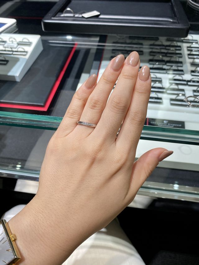 他のブランドの店舗にも行きました。まダイヤモンドが斜め一連に入ったデザインで指が綺麗に見えることや、常に身につける物であまり主張しすぎずに、なおかつ華やかなデザインが良いと思い、この指輪に決めました。
