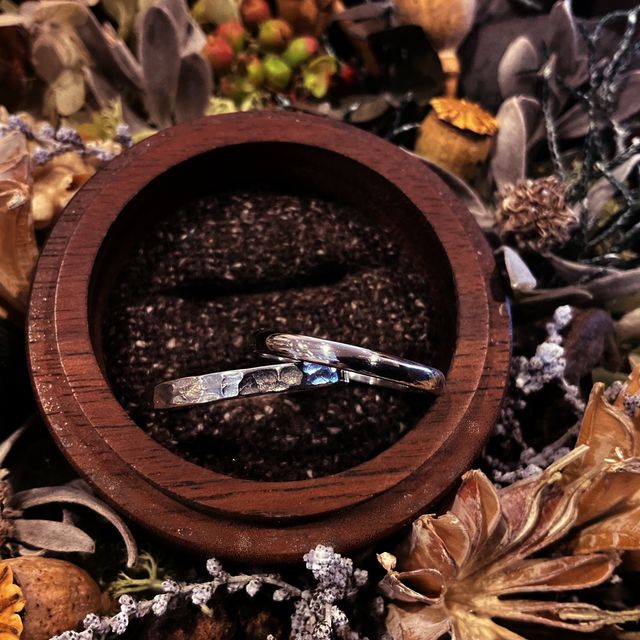 夫はシンプルなプラチナの甲丸、私は手作りの質感がわかりやすいプラチナのつちめにしました。