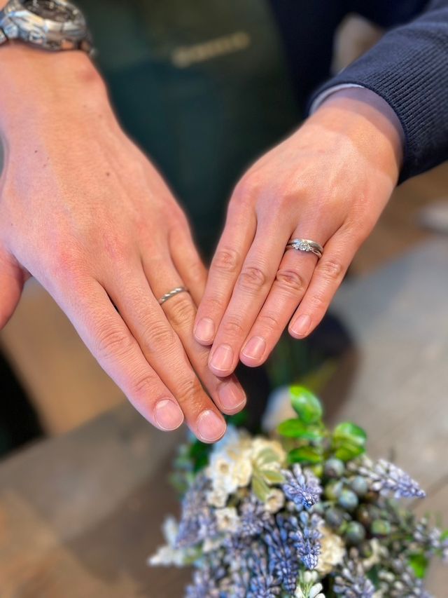 デザインはそれぞれで選択することで、ペア感を残しつつもお互いの好みにあった仕上がりになりました。今回は結婚指輪ということもあり比較的シンプルなものにしましたが、その他オプション込みで様々なデザインを選択出来るため、多くのカップルが2人とも納得できるような指輪に出来ると思います。