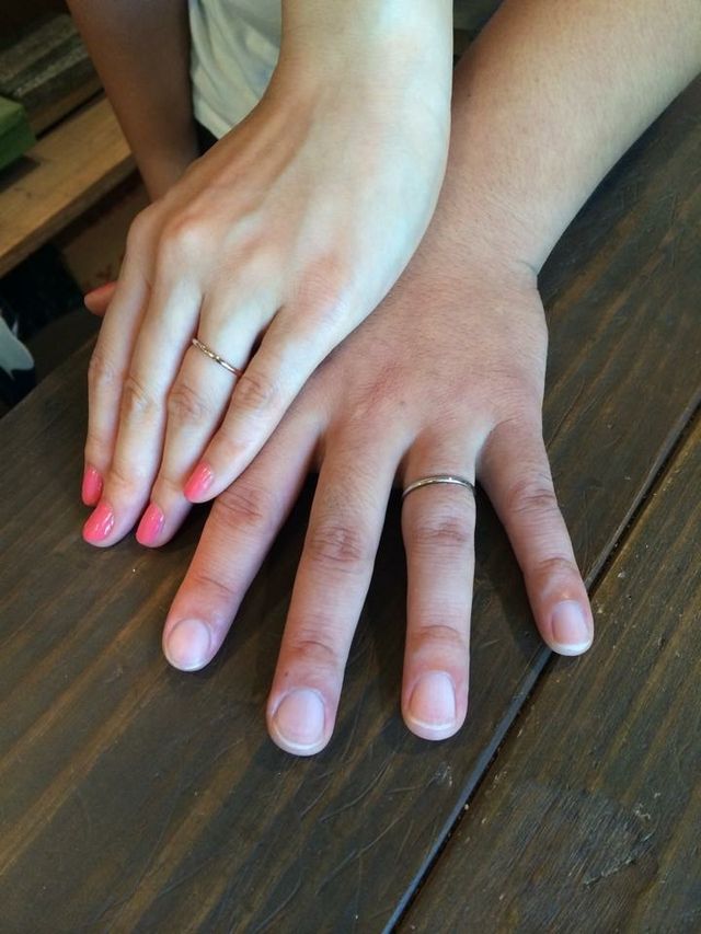 自分達で制作できる指輪とのことで、広告で見た瞬間『これだ』と思いました。私たちは、お互いの指輪を作り合いました。地金を熱して叩いて丸め、ロー付けも自分。ピカピカに磨く作業も自分です。(石もオプションで入れられるのですが、石留めは頼めるので安心です)