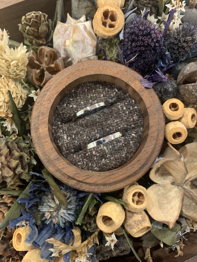 結婚指輪は長く身につける物なので、プラチナの1番シンプルなデザインを選びました。現物を見るまでは色はイエローゴールドの予定でしたが、プラチナの肌馴染みの良さ・いい意味で主張が少ないところに惹かれました。