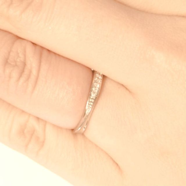 特に決めずに来店したので店員さんにシンプルなものよりもキラキラとしたものが好きですと相談したところ、出てきた指輪の中にあったものです。ウェーブが入っているところが可愛らしく、宝石の輝きは指輪の半分なので上品です。可愛いけれど落ち着きも感じさせるデザインだと思います。