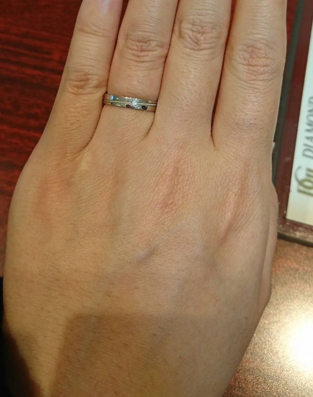 斜めのミル打ちデザインが可愛いです。ストーンも小さすぎずほど良い大きさでした。