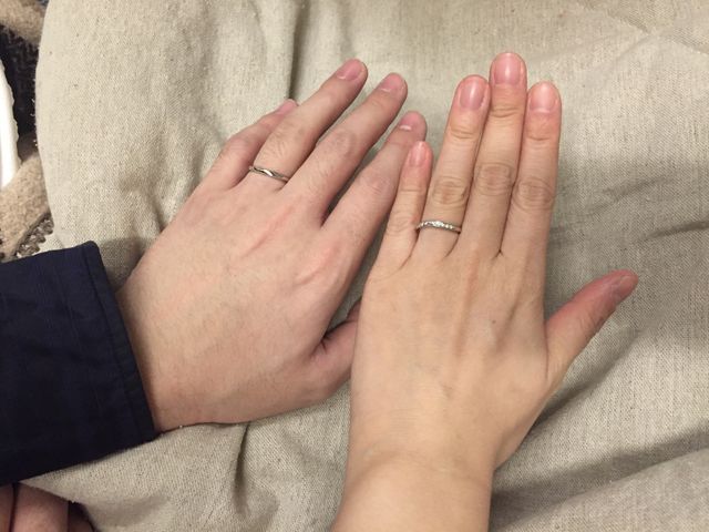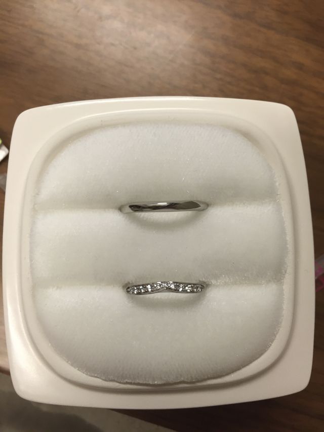 ペアリングもありますが、私たちは自分の指に合うものを各自優先したので名前はそれぞれ違う物ですがお互いに納得のいく指輪を選ぶ事ができました。