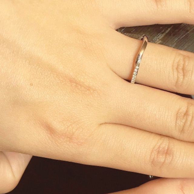 川の流れをモチーフにしたリングで、シンプルですが上品で綺麗だと感じました。メレダイヤが水面の輝きを表現しているとのことで、確かにキラキラとして素敵です。ウェーブが入っているため、指が長く見える効果もありますね。