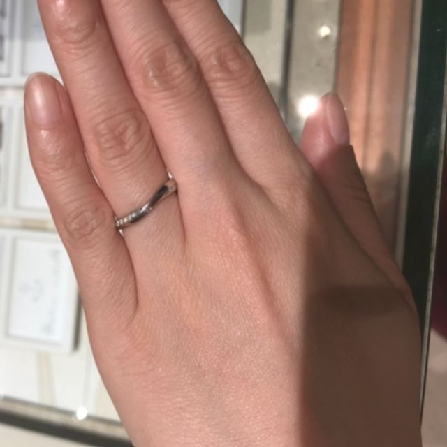 シャープな印象のカーブのラインが特徴的なリングであり、シンプルでありながら存在感があるのが良いです。サイドにはメレダイヤが配置されているので、しっかりとした輝きもありますし、カーブは緩めなので重ね付けもしやすそうですね。