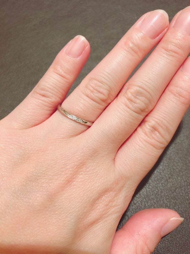骨格的にストレートタイプが似合うそうなのですが、ウェーブも気になっていました。この指輪はウェーブ調にデザインが入っているので、どちらも叶えられる点がよかったです。少し細めのデザインだったので、つけ心地もよかったです。