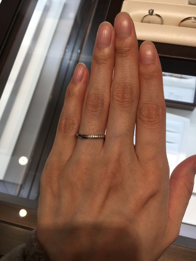 半分にダイヤが入っており、少し珍しいデザインかと思います。外側はダイヤが入っていないので、人から見ても派手になりすぎずさりげないキラキラが良かったです。細身のデザインなので、指が華奢な方や細身が好きな方には良いと思います。