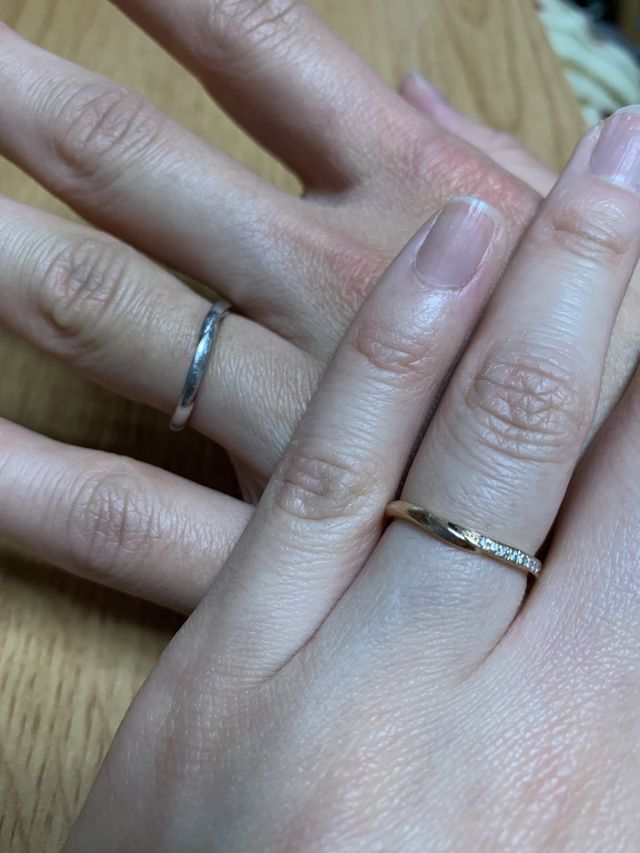 とにかく女性用は、ピンクゴールドのものを探していたのでその色があるデザインをたくさん試着しました。まっすぐでシンプルなデザイン、というよりは、すこしくびれがあってダイヤが少し付いていた方が好みだったのでこちらのものにしました。