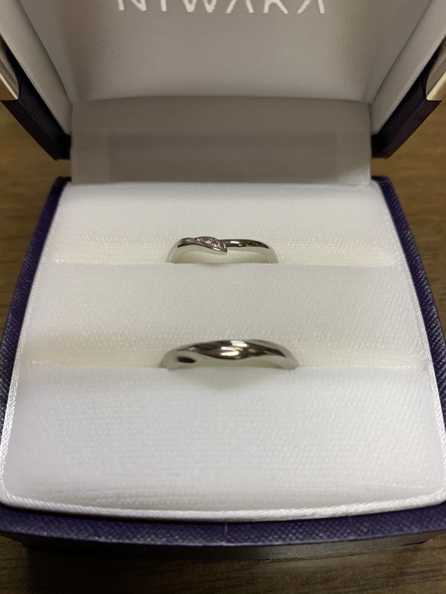 選んだ指輪はv字だったのと、石がピンクだったので一目惚れしました。男性用はガッシリした感じなのもカッコ良かったです。値段も婚約指輪を買わない予定だったので2人で30万円以内かな?と思っていたので予算以内で買えるなと思いました。