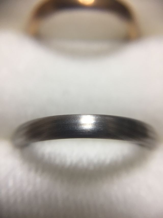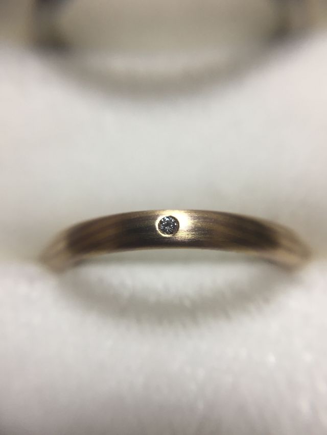 指輪選びの際に偶然NIWAKAさんのサイトに辿り着き、そこで一番最初に素敵だなと思った指輪でした。パッと見はシンプルですが、木目のデザインと、温かみのある色味、マット光沢だからこその輝きがとても美しいです。