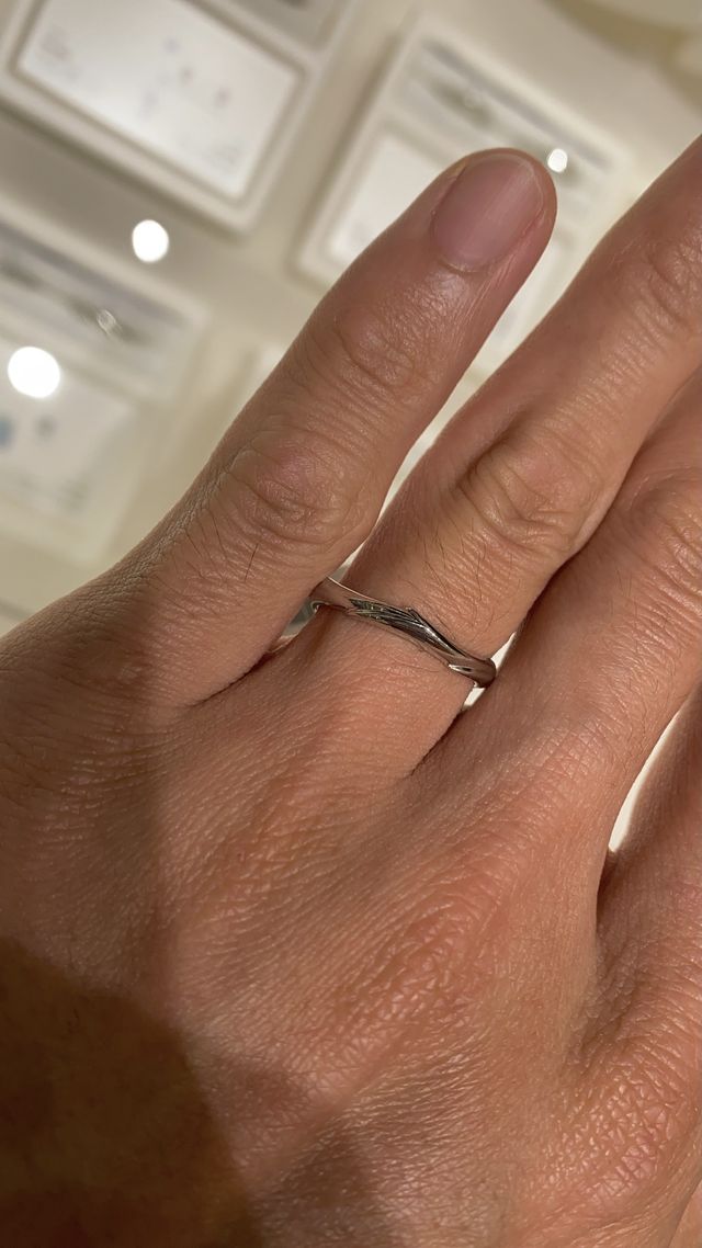 最初は嫁が結婚指輪っぽくないデザインだからと反対だったのですが、いざ店頭で着けてみると意外と華奢で綺麗な流線型のデザインがしっくりきて嫁からもOKをもらい購入に至りました。