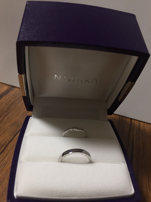 俄の「花麗」を購入しました。店舗に行く前から妻が俄を気に入っており、「花麗」の実物を見て一目惚れ。華やかを備えた大人っぽい印象が決め手。いくつになっても着けていられるシンプルさも好印象。素材はシルバー、ゴールド、プラチナから選べるが、輝きに加え耐久性を考慮してプラチナに。