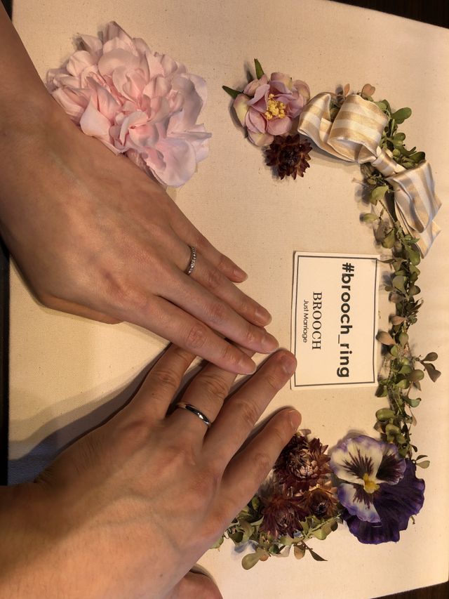 シンプルなのがいいと希望していろいろ見せてもらいましたが、シンプルなのにシンプルすぎず、指が綺麗に見えるところが気に入りました。夫のほうも、シンプルながらウェーブのデザインが綺麗で似合っていたのでいいなと思いました。