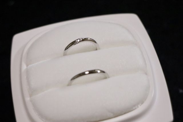 デザインがシンプルで、長く着用するにあたり飽きなさそうで良いと思った。シンプルであっても、ダイヤがいくつか付いていて高級感もあり大変気に入ったので決めた。相手のデザインも斜めにラインが入っていてかっこよくお洒落だなぁと思った。