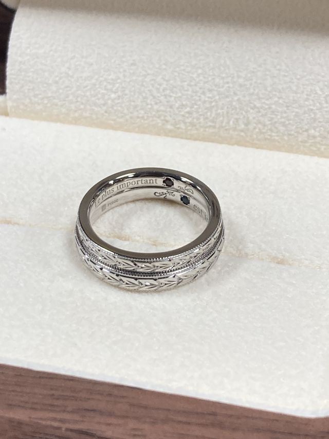 指輪のデザインは2人がイメージした月桂樹がメインです。月桂樹は「夫婦の木」「幸福の木」という意味合いを持っています。その上下をミル打ちしてクラシックな