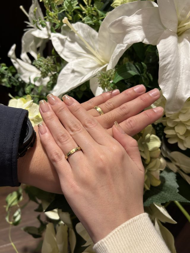 デザインは自分たちの要望をしっかり聞いてくださり、希望通りのものができあがり満足しています。イエローゴールドの色味もとても気に入りました。指輪の製造方法もしっかり教えてもらい、頑丈そうで安心しました。これから毎日つけるのが楽しみです。