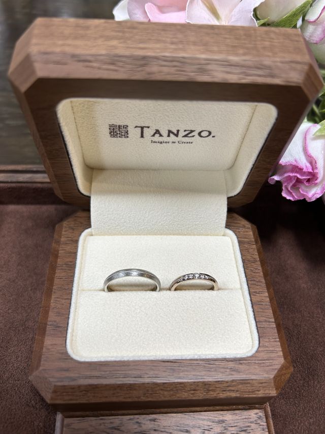 素材(色)や形、加工をそれぞれで変えているものの、センターのミル打ちのラインを揃えたことでペア感のある仕上がりになりました。