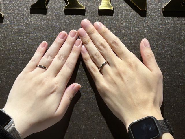 指輪のデザインを一から自分たちで決めることができ、世界に一つだけの指輪が作れました。鍛造製法で作っていただき、この先も安心してつけていられる指輪に仕上がってとても満足です。鍛造梅田店でお任せして良かったなと思いました。