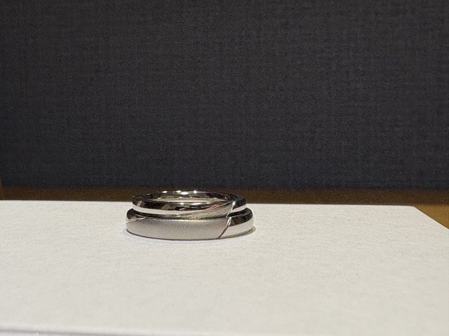 シンプルだけど少しデザインが入っているような指輪を探しており、希望通りストレートの指輪に斜めのライン2本が入ったデザインに仕上げていただきました。ライン2本の傾きがそれぞれ異なり、相手の指輪と重ねるとラインが重なるようになっており、ずれもなく大変綺麗に仕上げていただきました。