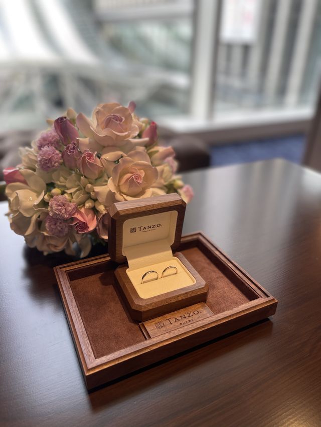 鍛造製法でつくられており強度もあるとのことなので、安心してつけることができ嬉しいです。また、2人とも指輪の厚さや色味など好みがちかったので、それぞれ変えることができました。指輪の箱もウォールナットでとても素敵でした。