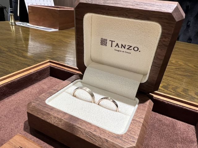 結婚指輪というとシルバーのイメージがありますが、ゴールドの指輪を作りたかったので色々調べてTANZOさんにたどり着きました。職人さんが1から手で作るというところと、何よりも1つの素材から2人の指輪を作っていただくことができ、素材からお揃いにできるというところに惹かれました。