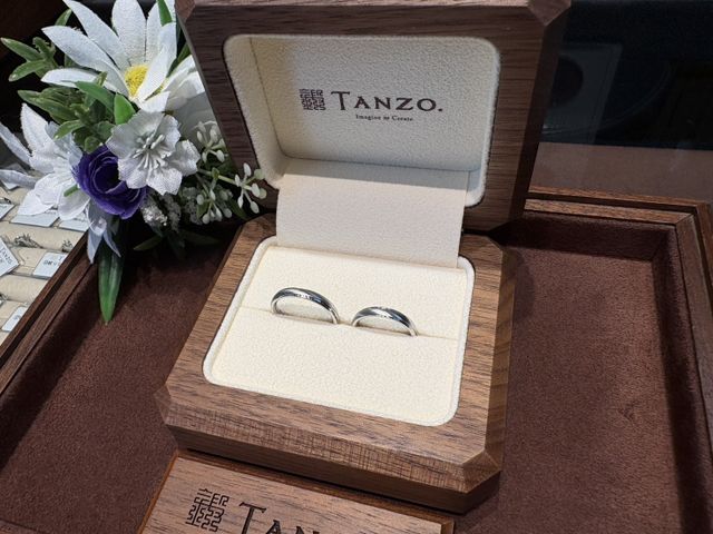 既製品のものではなかなか全周デザインのものがなかったのでオーダーメイドで製作することにしました。タンゾーさんにご相談したところ、サンプルの指輪と資料をみせてくださり、ライン一つ決めるのでもこんなにも選択肢があるのに驚きました。納得のいく指輪のデザインになりました。