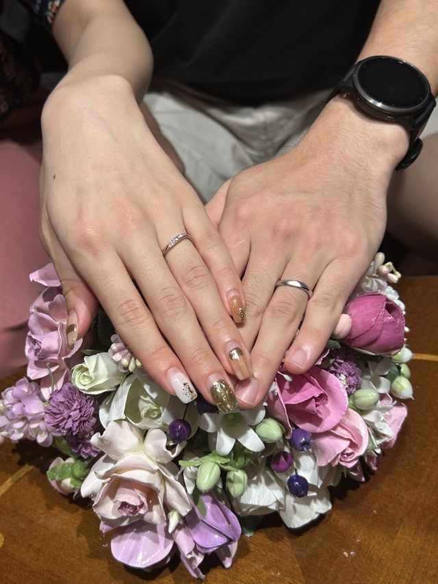 夫の指輪にはダイヤはないですが、私のダイヤの箇所と同じ部分にマット加工を施し、2人とも捻れたデザインにしたので、デザインは違えどお揃いにできたのがポイントです。