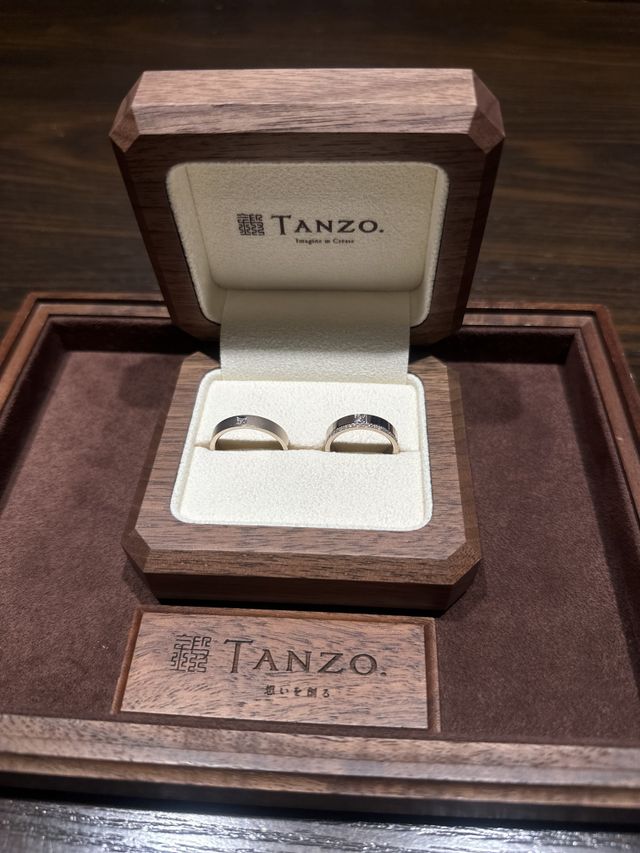 結婚指輪は一緒物なので、サイズ感が心配でした。TANZOさんでは、結婚指輪を作成するまでに、サイズや太さの感覚を確かめられる様に仮の指輪を作成し数週間~数ヶ月毎日つけてみた後、最終的にサイズ等を決定することができました。他のブランドでは聞いた事がないサービスで衝撃を受けました。こちらのサービスのおかげで安心して結婚指輪の作成をお願いすることができました。また、クリーニングやサイズ直しなどのアフターサービスも充実しているため安心です。また、鍛造製法なので一生モノとして安心して毎日使うことが出来るのも良いなと思いました。指輪のケースもくるみの木を使用した温かみのあるケースでとっても素敵です。