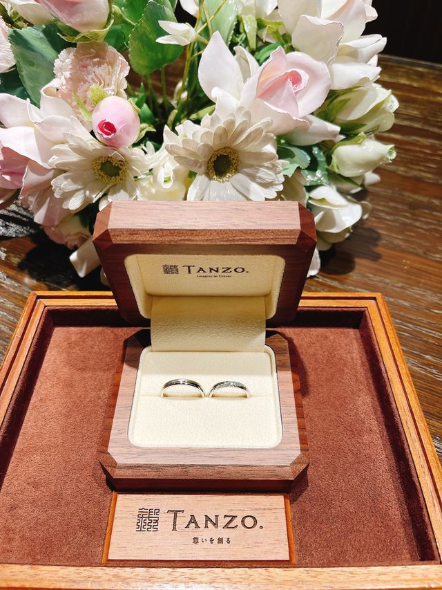 夫婦で統一感をもたすためグリーンゴールドのラインと鏡面・マット加工を揃えました。