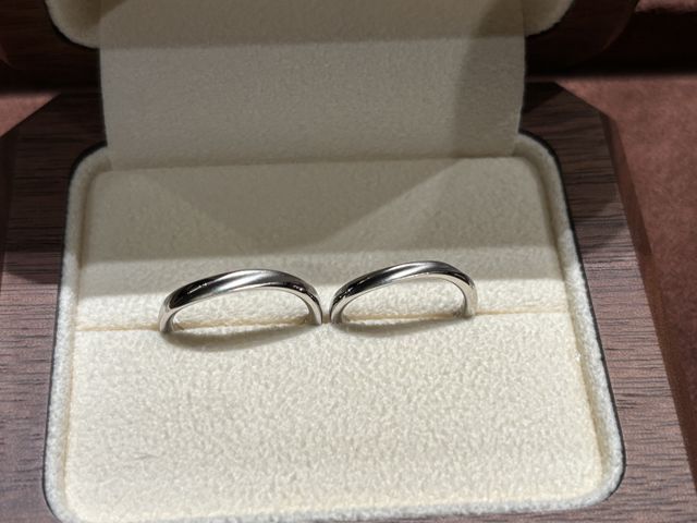 長期間つけるものであるので、飽きにくいシンプルなデザインにした。また、全体をS字の曲線にし、真ん中をえぐることで、真ん中に梨地加工を施しても取れにくいようにした。内側に2人の名前を入れ、フルオーダーの作品である。