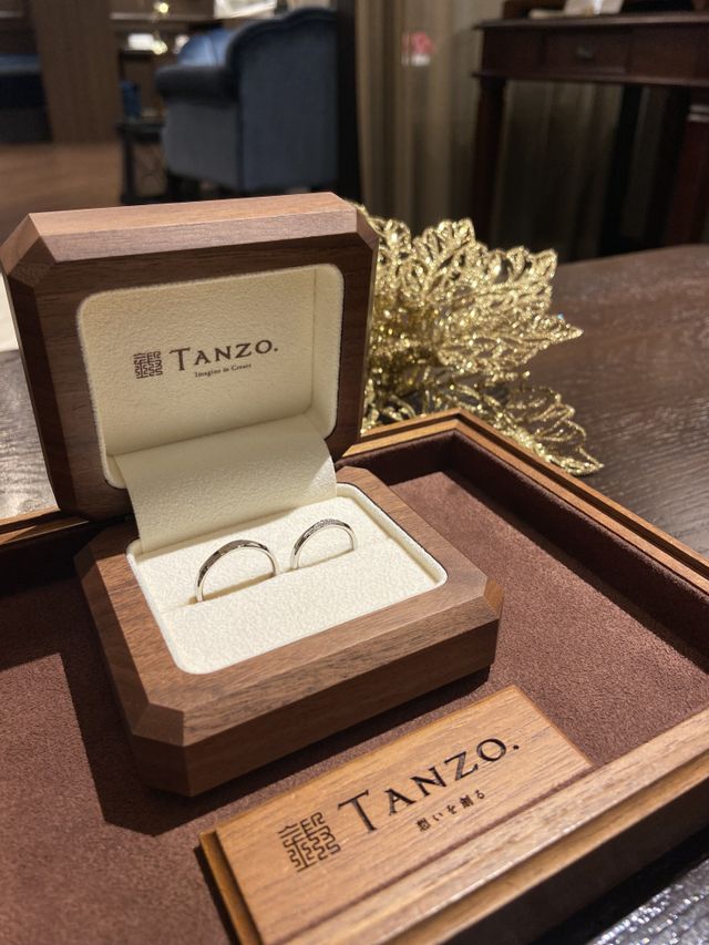 担当の方とご相談しながら、ふたりの好みのデザインに仕上げることができるフルオーダーでした。二人案を出しながら作ることができるので、好きを追求して作っていただけました。婚約指輪は細めのデザインが多いですが、TANZO.は太さも変更できるので、少しカジュアル目かつ存在感のあるデザインで作成していただけました。