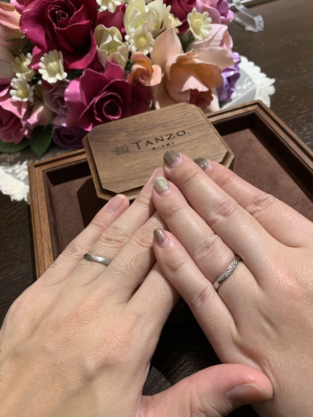 とにかく丈夫なもので、着け心地がよいものを探していました。そして、一生に一度のものと思っていたので、気持ちよく購入出来る店舗が良いなと思っていたところ、TANZO梅田店のスタッフさんは対応が心地よくて、このお店で購入したいと思いました。デザインも自分たちで選んで作れて良かったです。