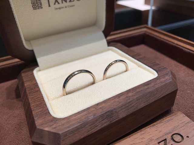 プラチナにも憧れがあったため、婚約指輪はプラチナ、そして今回の結婚指輪は彼がシャンパンゴールド、私がコーラルゴールドです。