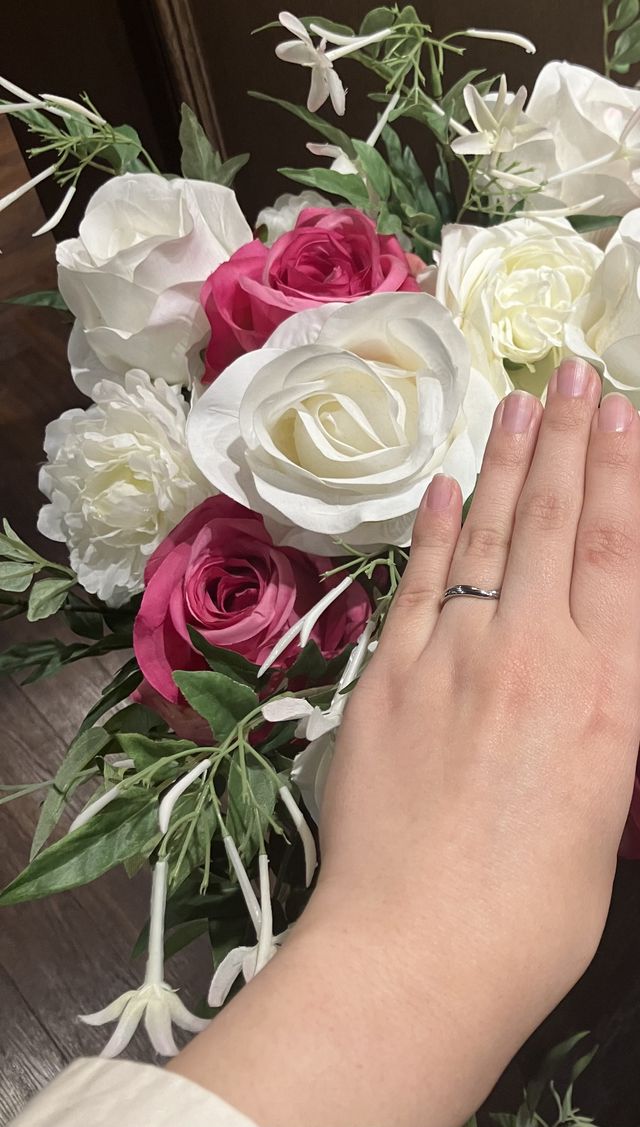 また、出来上がった指輪を引き取りに行った際は、エントランスで記念撮影をしてくださり記念となりました。