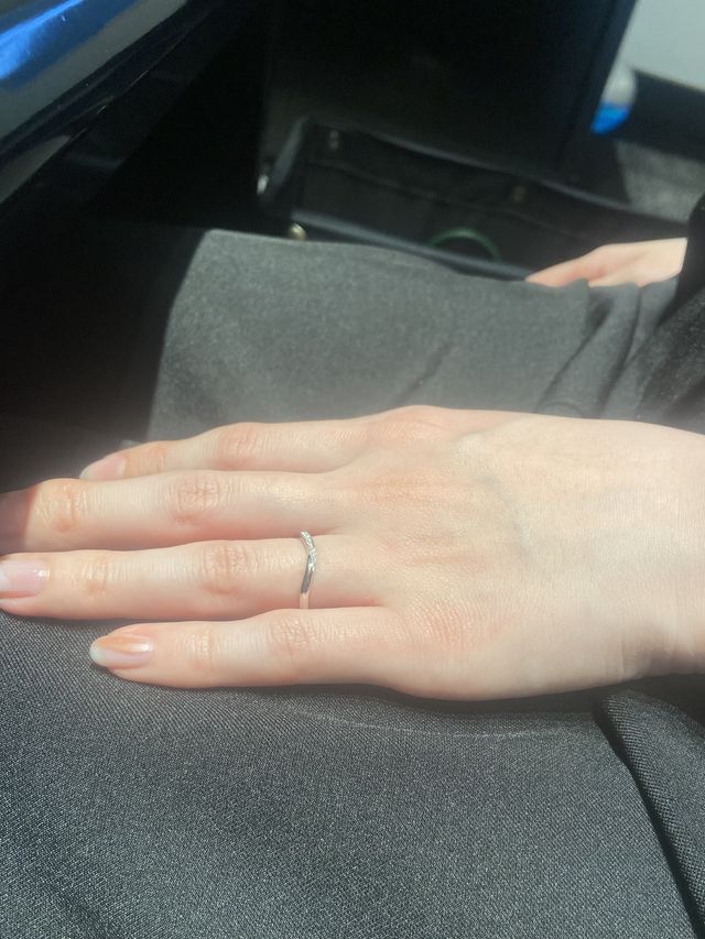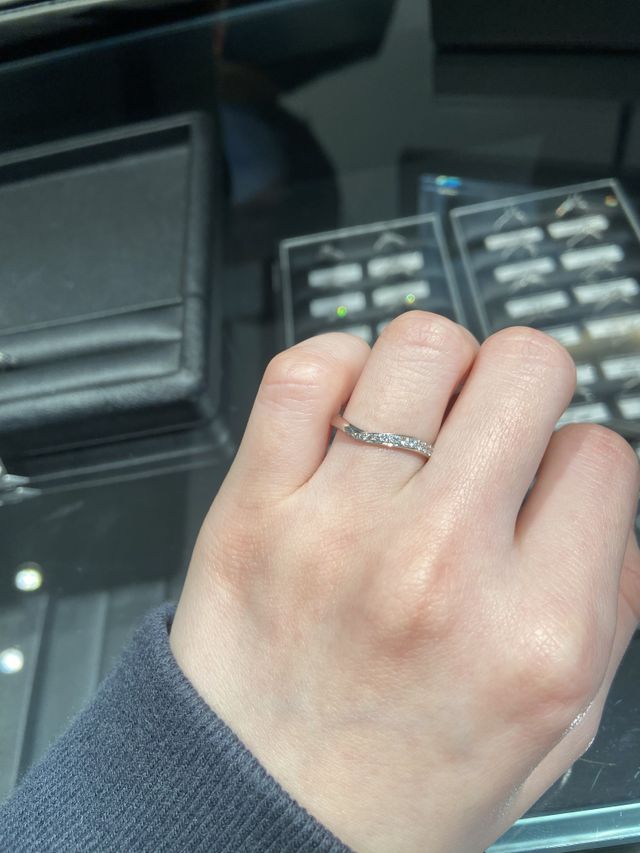 シンプルなものがすきだけど、キラキラしているのも可愛い…と思いながら結婚指輪を探していました。水かきの高低差が気になる私にとってはストレートよりも、緩やかなVラインになっているものの方が似合うと思い、またシンプルかつキラキラという希望も叶えてくれる指輪でした。少し細いかな…と思っていましたので、他のデザインのぷっくり感を参考に、フルオーダーでお願いしました。写真は完成品ではなく、既製品のお店のサンプルです。