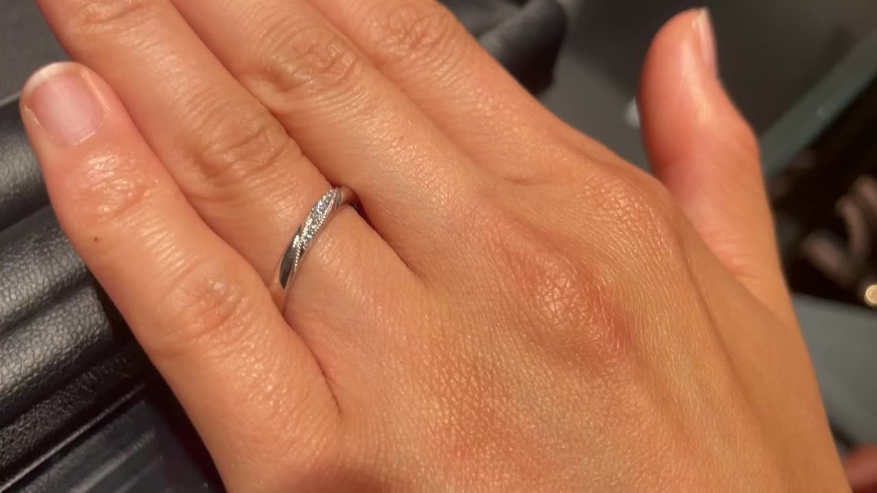 デザインの豊富さもそうですが、ダイヤモンドの輝きもとても良いと感じました。試着した最後に、仕上がりイメージとして試着用のものとは違う実際の輝きのダイヤモンドを見せていただきました。今までジュエリーを身につけたことがないので、ダイヤモンドはこのくらいのものなのだと思って試着していましたが、そんなことはないくらいの素敵な輝きで驚きました。