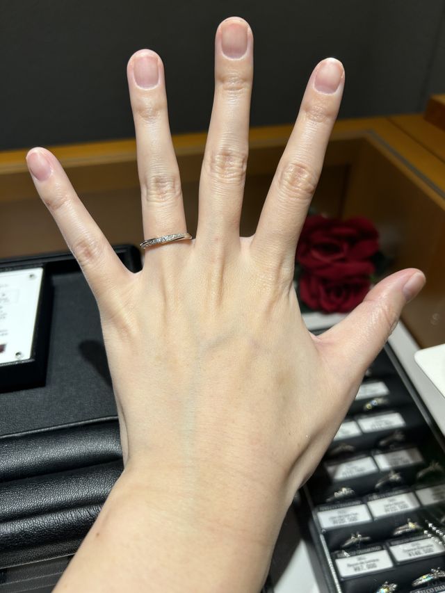 普段、指輪を全くつけない私ですが、付け心地が良くてずっと付けていても違和感がないです。ダイヤがしっかり入ってますが、主張しすぎないけど華やかさもあって可愛いと、周りにすごく褒められます!お気に入りです!