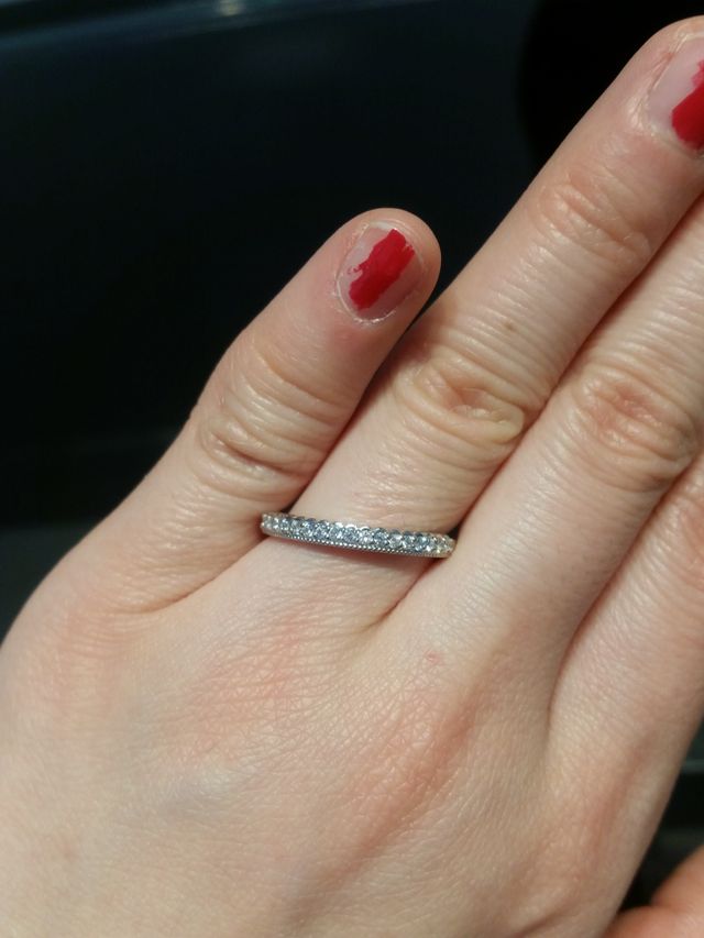 華やかでキラキラとした結婚指輪です!繊細なレースのようなデザインで可愛いです。ただ、全面に施されていないのでくるっと回ってしまった時中途半端な感じになるかもです。女の子らしさを求める方にぴったりです!