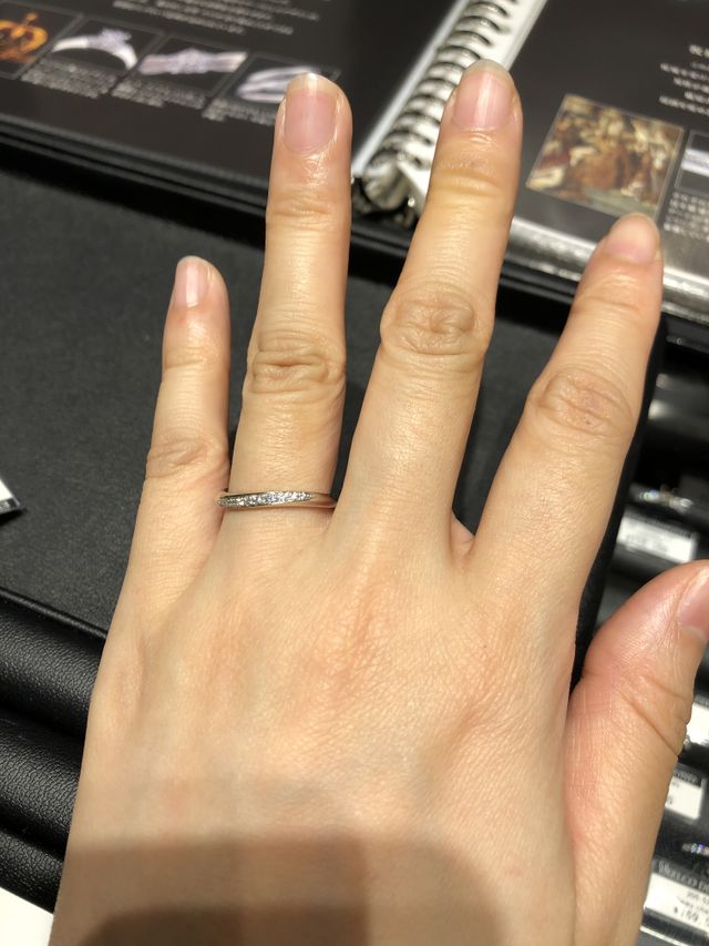 婚約指輪と重ね付けできる指輪を探していましたが、その中でも結婚指輪単体で着用してもシンプルすぎるキラキラとしたダイヤが少しでもはいっているデザインのものを探していました。こちらはごつごつしたデザインではなく華奢なデザインの指輪で上品な指輪でした。