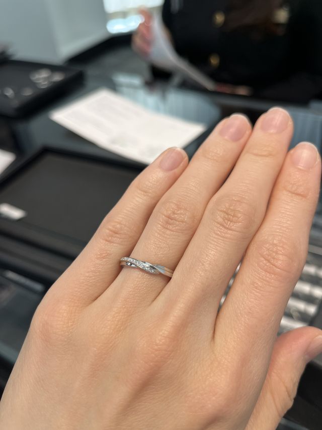 結婚指輪を探し始めて、エクセルコには3回伺って購入しました。2回目までは候補になかった指輪に決めました。特にパートナーが一目惚れで気に入っていました。つけ心地も良いです。ねじれたデザインで男性用は少しつや消しになっているのが良いそうです。
